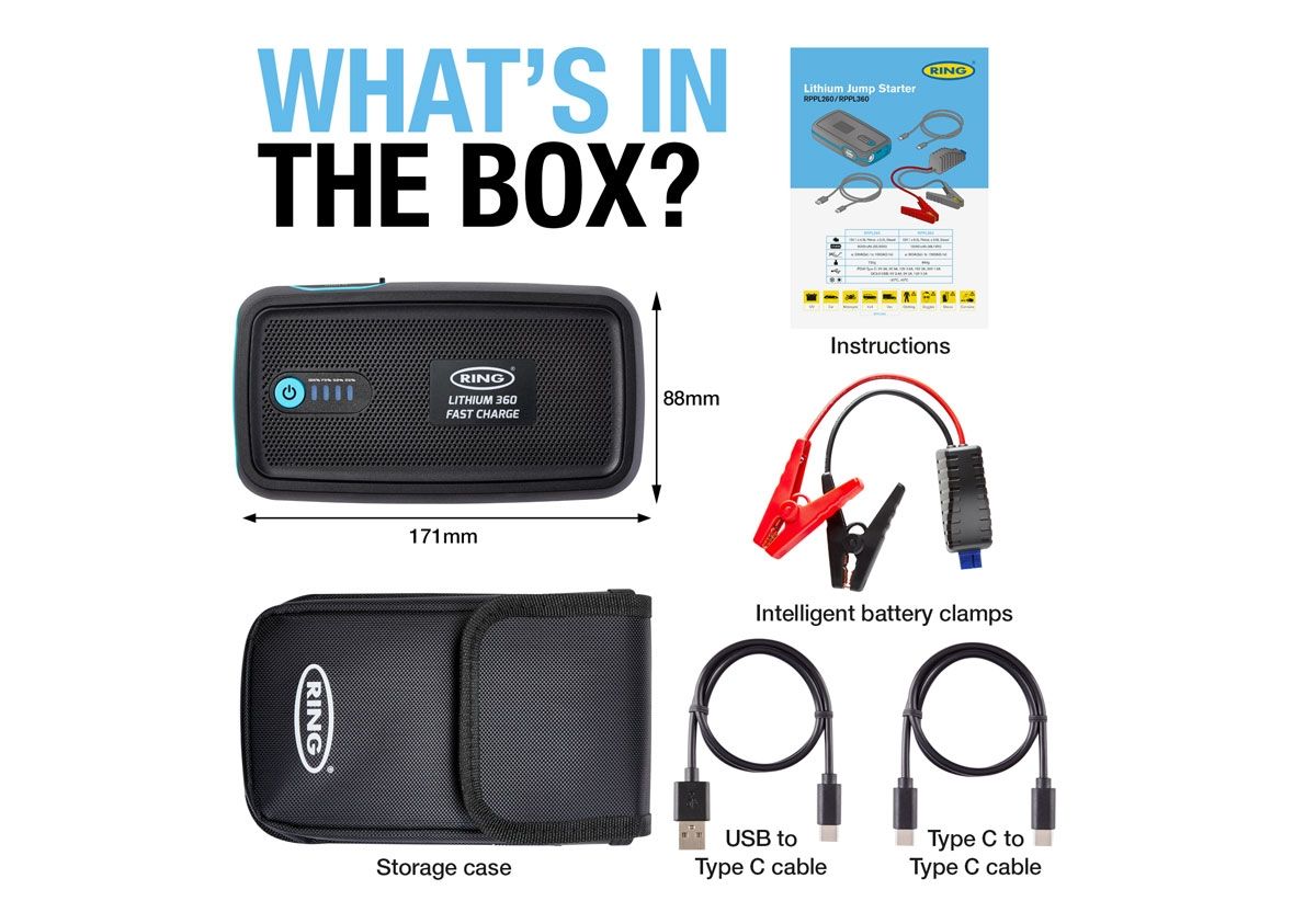The RING Portable Lithium Fast Charge Jump Starter and Power Bank is a powerful, safe and compact Lithium Cobalt LiCoO2 piece of kit! Able to start 12V vehicles up to 6L petrol and 3L diesel engines in under 60 seconds! This equipment also provides rapid recharge power via the PD30W USB-C for electronic gadgets. The compact and portable design fits easily into small spaces without the compromise of power.